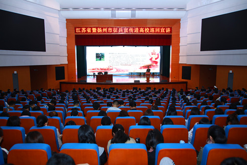 此次活动由江苏省政府征兵办公室、江苏省教育厅主办,扬州市政府征兵办公室和扬州大学承办,邗江人武部、扬州市各高校人武部部长、师生代表等近600人参加会议。宣讲期间,扬州市征兵办和扬州大学共同设置了征兵政策咨询台,发放宣传材料,提供政策咨询,并启动了我校“征兵宣传月”活动。