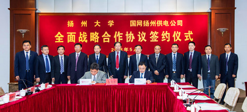 5月26日,学校与国网扬州供电公司全面战略合作协议签约仪式在荷花池校区行政楼一楼报告厅举行。校党委书记姚冠新、国网扬州供电公司总经理许扬出席仪式并致辞。校长焦新安出席活动,并与许扬一起共同为“扬州大学智慧能源互联网研究院”揭牌。副校长黄建晔代表学校与国网扬州供电公司副总经理车凯签署《全面战略合作协议书》和《支持建设“扬州大学智慧能源互联网研究院”合作备忘录》。副校长洪涛主持签约仪式。