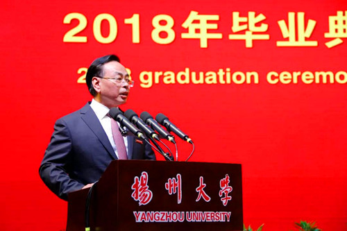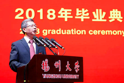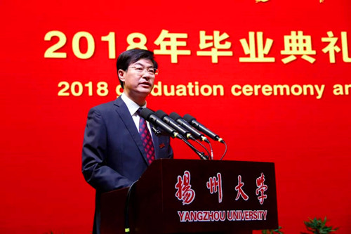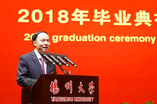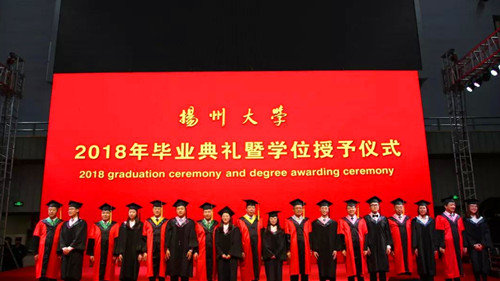 6月20日下午,扬州大学2018年毕业典礼暨学位授予仪式在荷花池校区体育馆隆重举行。姚冠新、焦新安、叶柏森、刘祖汉、黄建晔、陈国宏、洪涛、陈亚平、周琴、俞洪亮、费坚等全体校领导,校学位评定委员会全体委员,各学院、机关各部门、各直属单位、各科研实体机构主要负责人,教师、学生家长和亲友代表,与8000余名2018届毕业生欢聚一堂,共同参与、见证他们生命历程中的重要盛典。校党委副书记叶柏森主持典礼。校党委副书记、副校长刘祖汉,副校长俞洪亮分别宣读学位授予决定和优秀毕业生表彰决定。
