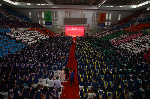 典礼上,我校师生精心创作、演绎的青春歌曲联唱、诗朗诵《归来仍少年》、男女声二重唱《不忘初心》和歌舞表演等精彩节目,博得了毕业生们阵阵热烈的掌声。整场典礼,全体毕业生用一次次雷鸣般的掌声表达了他们对母校的眷恋和对未来的信心。典礼结束时,全体2018届毕业生高唱校歌,优美激昂的旋律在体育馆里久久回荡。