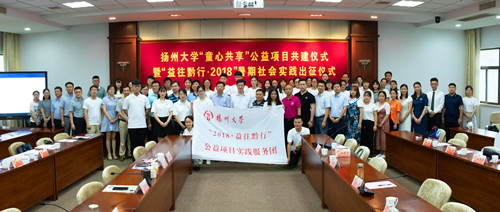 7月5日上午,扬州大学“童心共享”公益项目共建仪式暨“益往黔行•2018”暑期社会实践出征仪式在行政楼一楼报告厅举行。校党委副书记叶柏森出席仪式并讲话,副校长洪涛为实践服务团队授旗。