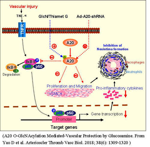 龚开政教授研究团队利用体外主动脉平滑肌细胞原代培养模型并结合整体动物研究,采用多种先进的分子生物学实验技术,系统地阐明了A20负性调控NF-kB信号通路的新机制。尤为重要的是,该项研究在国际上首次证实了蛋白质O-GlcNAc修饰是A20重要的活性调节机制,是介导葡萄糖胺发挥血管损伤保护效应的关键效应靶标。这些重要发现提示,急性增加蛋白质O-GlcNAc修饰水平有可能成为有炎症激活参与的众多心血管疾病治疗的一种新型干预策略。