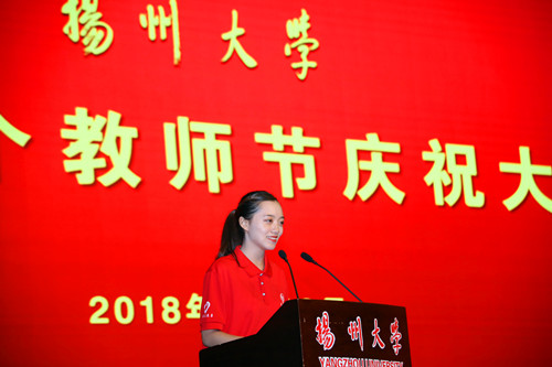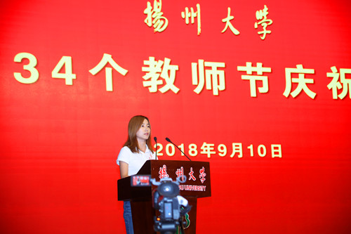 会上,教师代表、兽医学院刘宗平教授,新入职教师代表、化学化工学院朱荣妹老师,学生代表、校研究生会主席叶蕴灵同学分别发言。刘宗平在发言中表示,作为一名扬大教师,要牢记自己的历史使命,秉承前辈们的优良传统,坚苦自立,严谨笃学,勇于创新,奋发进取,为学校事业的发展贡献自己的力量。朱荣妹表示,作为新教师,在以后的教学科研中,将勤学多问,精研深探,增强素养,提高水平,把一腔热诚投入到工作,将一片爱心奉献给学生。叶蕴灵说,学生的每一点进步,都离不开老师们悉心地教导;每一份荣誉,都浸透着老师们辛勤的汗水;每一步成长,都凝聚着老师们期盼的心血。作为学生,将始终秉持“坚苦自立”的校训,立鸿鹄志,做奋斗者,不负学校的期望和老师的培养。