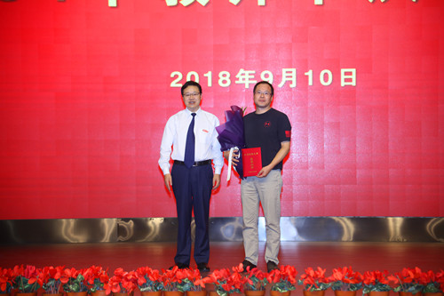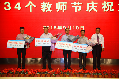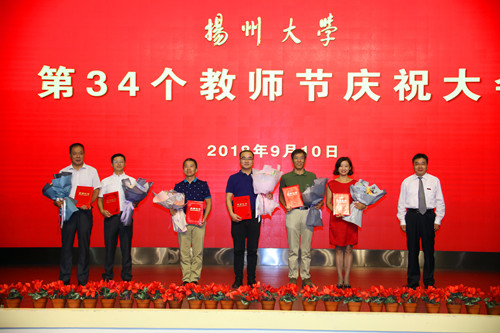 9月10日下午,学校在文汇路校区大礼堂隆重举行第34个教师节庆祝大会。校党委书记姚冠新为全国实践育人创新创业基地、2018年度全国创新创业典型经验高校、江苏省优秀教学成果奖特等奖等奖项获得者颁奖,一一合影留念,并发表热情洋溢的讲话。校党委副书记叶柏森主持大会。校党委副书记、副校长刘祖汉,副校长黄建晔、陈国宏、洪涛、陈亚平、俞洪亮分别为国家“千人计划”青年项目入选者、国家“万人计划”科技创新领军人才和科技创业领军人才、国家“万人计划”教学名师等奖项获奖者颁奖。