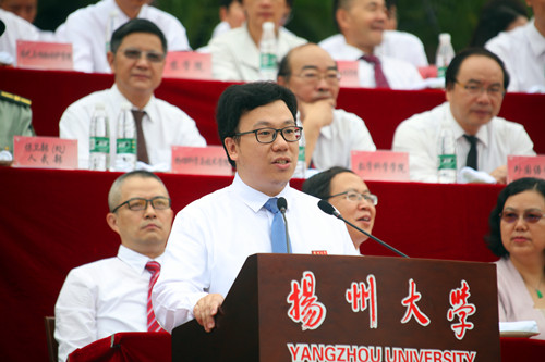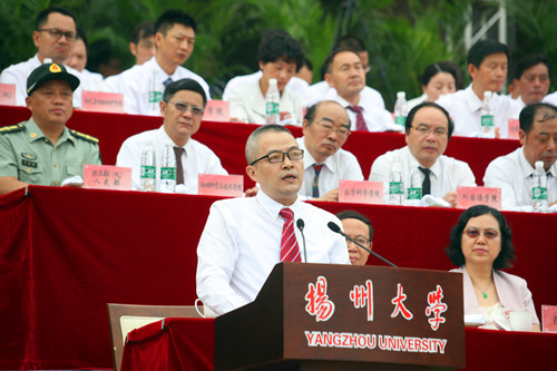开学典礼在庄严隆重的升国旗仪式中拉开帷幕。姚冠新首先以3名新生与扬大的故事开篇,向全体新同学表示热烈的欢迎,并以“在坚苦自立中问道大学之‘大’”为主题,为大家上了“大学第一课”。姚冠新指出,对于大学本身来说,大学之“大”,就在于能在授业解惑中引人以大道、育人以大德、启人以大智;而对大家来说,大学之“大”,则表现为理想之远大、知识之博大、本领之强大。他勉励新生始终秉承“坚苦自立”的校训精神,在进德修业中,潜心问道大学之“大”。