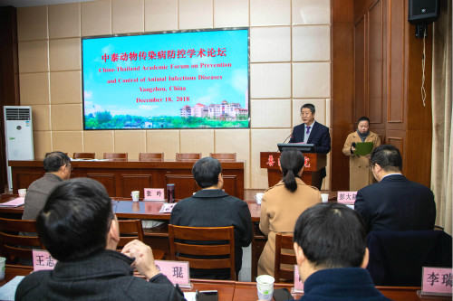 12月18日,中泰动物传染病防控学术论坛在文汇路校区兽医学院二楼报告厅举办。副校长陈国宏出席论坛并致辞。泰国农业大学兽医学院院长Khongsak Thiangtum、副院长Tanu Pinyopummintr等出席论坛。