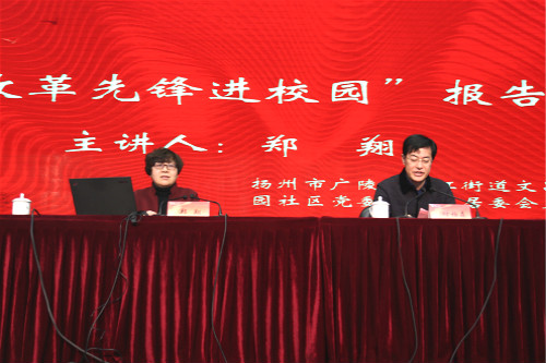 2月27日下午,由省委宣传部、省教育厅、团省委主办的“改革先锋进校园”活动扬州市首场报告会在荷花池校区大学生活动中心三楼小剧场举行。党的十八大、十九大代表,扬州市广陵区曲江街道文昌花园社区党委书记、居委会主任郑翔同志应邀来我校作报告。校党委副书记叶柏森主持报告会,并为郑翔颁发“校外兼职辅导员”聘书。