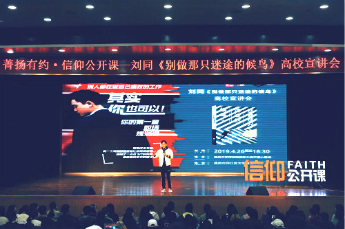 4月26日晚,学校在荷花池校区大学生活动中心三楼小剧场举办2019年“菁扬有约”信仰公开课——刘同《别做那只迷途的候鸟》分享会。我校师生读者近700人参加活动。