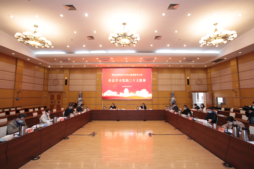 焦新安要求,要抓好组织实施,迅速掀起学习宣传贯彻党的二十大精神的热潮。全校上下要把学习宣传贯彻党的二十大精神作为当前和今后一个时期的首要政治任务。要加强组织领导,全校各级党组织要分层次、分专题组织开展好丰富多彩的学习活动;要抓好学习宣传,做到学深悟透、融会贯通,真学真懂、真信真用,把党的二十大精神融入体现到思政课程与课程思政中;要抓好研究阐释,充分发挥学校优势,有组织地开展研究和阐释,力求推出一批高水平研究成果。