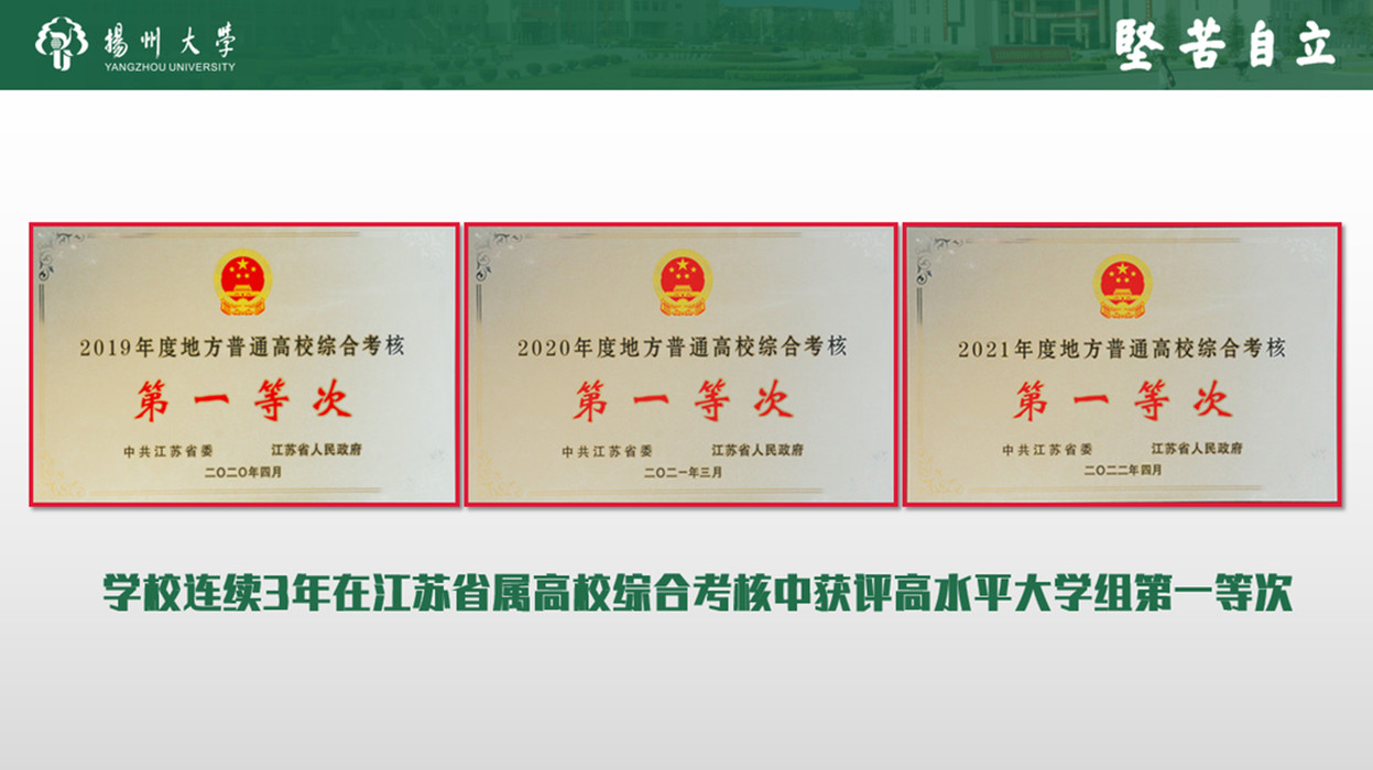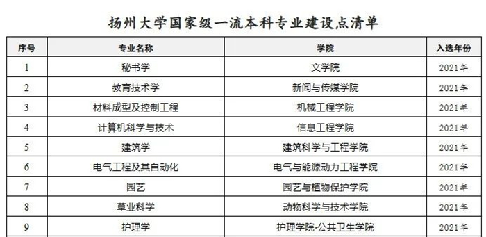 新增国家级一流本科专业建设点9个、省级一流本科专业建设点7个、产教融合品牌专业建设点与培育点2个。获省教学成果奖13项,其中高等教育类成果奖一等奖5项,基础教育类成果奖特等奖1项。新增“四新”专业4个。6个专业通过专业认证。获本科实验教学学科竞赛国家级奖项3项。获评江苏高校省级优秀基层教学组织3个。获省教师教学创新大赛特等奖1项、省微课教学比赛一等奖2项、省高校青年教师教学竞赛一等奖1项。获批“全国首批科技小院”9个。获批教育部产学合作协同育人项目42项、供需对接就业育人项目5项。1个项目入选教育部首批虚拟教研室建设试点名单。获批省研究生科研实践创新计划项目321项、暑期学校4个、学术创新论坛3个、教改课题5项。新增省优秀研究生工作站2个、省优秀产业教授2人,新增省产业教授9人、研究生工作站15个。获评全国农业专业学位研究生实践教育特色基地1个、教学成果奖3项、教改课题4项和优秀工作案例1个。入选全省高校示范马克思主义学院、省乡村振兴人才培养优质校、全国“2022年高校职业生涯咨询特色工作室”、全国“一站式”学生社区综合管理模式建设试点高校。获第十七届“挑战杯”全国大学生课外学术科技作品系列竞赛特等奖1项,连续第7次喜捧全国“优胜杯”。获第八届中国国际“互联网+”大学生创新创业大赛银奖2项。连续第24次获评全国社会实践活动优秀单位。3个项目获第六届中国青年志愿服务项目大赛银奖。研究生高水平学科竞赛国家级获奖数124个,同比增长103%,其中一等奖18项。广陵学院连续三年入选中国高水平独立学院。