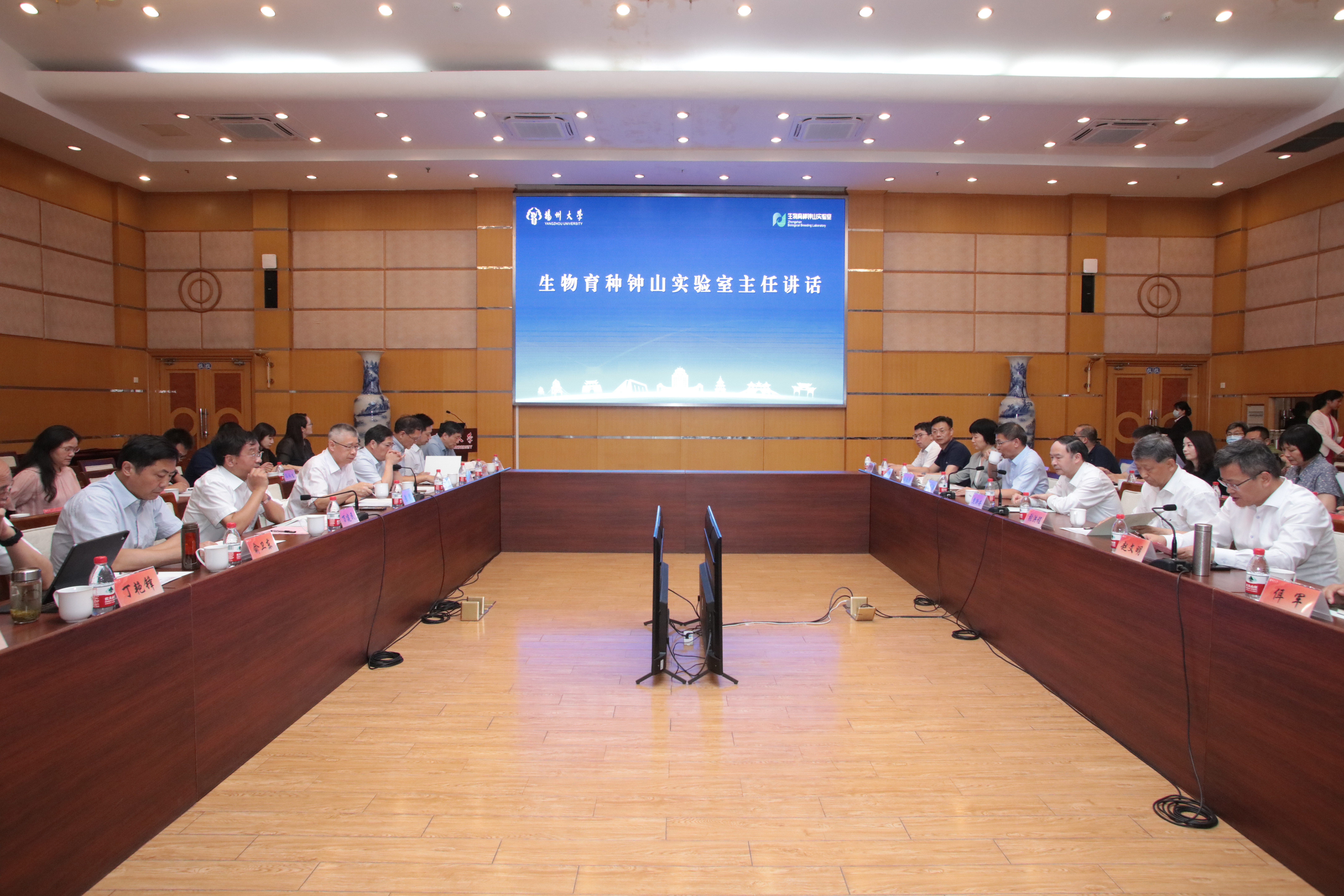 省科技厅科研机构处、省农业农村厅种业管理处、扬州市科技局、扬州市农业农村局主要负责人,生物育种钟山实验室成员,我校党办、校办、研究生院、学科办、科技处、社合处、人资处、国际处、国资处、设备处以及农学院、园艺学院、动科学院等部门及单位主要负责同志参加活动。