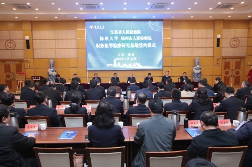 3月28日,学校与江苏省人民检察院、扬州市人民检察院举行三方共建“江苏省职务犯罪检察研究基地”签约仪式。江苏省检察院党组书记、检察长石时态与校党委书记焦新安出席活动并共同为研究基地揭牌。校长丁建宁主持签约仪式并代表我校与江苏省人民检察院、扬州市人民检察院签约。江苏省人民检察院党组副书记、副检察长李爱君,江苏省人民检察院副检察长丁海涛,扬州市委常委、政法委书记张耀武,扬州市人民检察院党组书记、检察长鲍书华,副校长王承堂等领导出席活动。